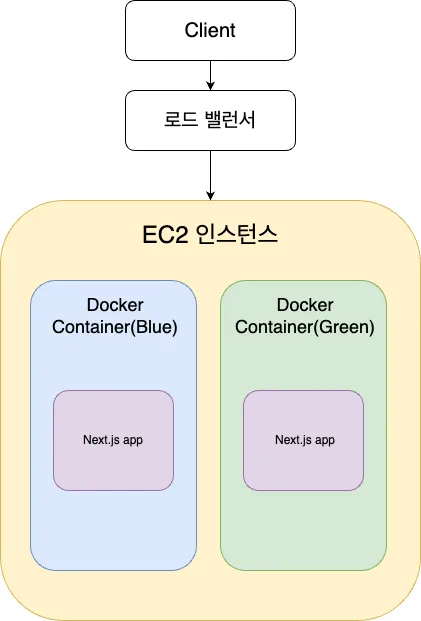 사용자가 서버로 (기본 80포트) 요청을 보내면 로드 밸런서의 대상 등록(타겟 등록)을 통해 EC2 인스턴스 안 내부에 있는 Docker 컨테이너(3000포트)로 요청을 보냅니다. Docker 컨테이너 내부에서는 Next.js 서버가 실행되고 있습니다.